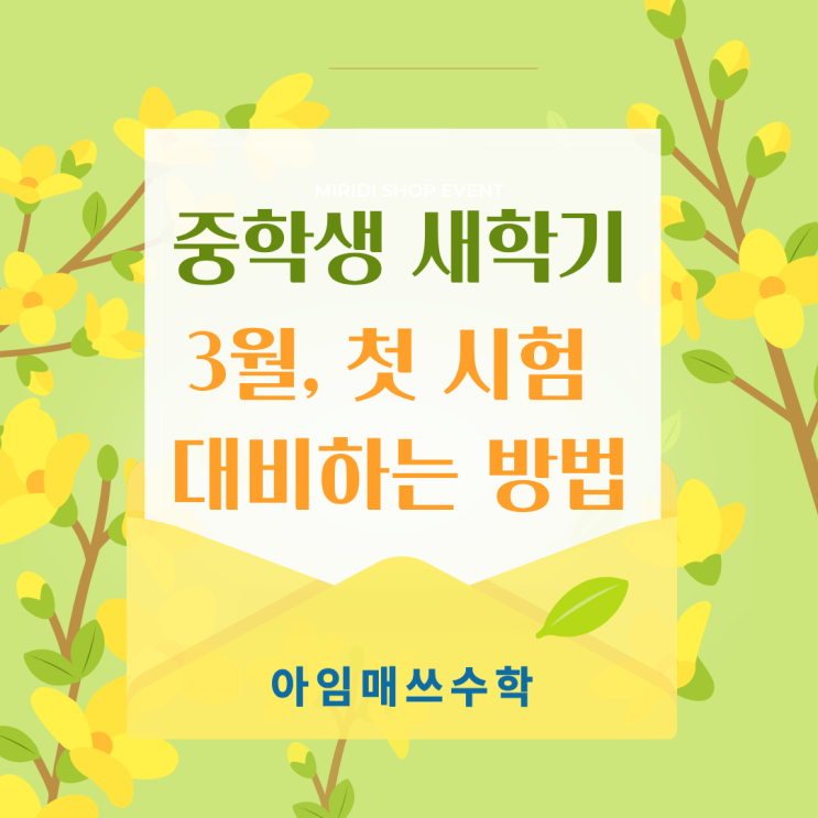 안녕하세요. 아임매쓰수학입니다. 중학생이 되면 수학 성적은 생각보다 빠르게 갈립니다. 특히 새학기 3월, 첫 단원 평가와 첫 중간고사 준비 과정은 그 해 수학 성적의 방향을 결정하는 중요한 시기입니다. “아직 학기 초인데 괜찮겠지”라는 생각은 중등 수학에서는 통하지 않습니다. 중학생 새학기, 3월 첫 시험을 제대로 준비하는 방법을 아임매쓰수학에서 제시해 드립니다. 1.학기 초는 ‘적응 기간’이 아니라 ‘기초 확립 기간’입니다. 중학교 수학은 초등 수학과 달리 개념의 깊이와 문제 난이도가 크게 상승합니다. 특히 ▶중1은 초등과 전혀 다른 구조의 수학을 시작하고 ▶중2는 함수와 도형의 심화가 시작되며 ▶중3은 고등 수학과....... <img src="https://blogthumb.pstatic.net/MjAyNjAyMjFfMjIg/MDAxNzcxNjUyNjE2ODIw.hgGi19xqq4eBBtwmQ1iuw2eg-n5kpaRo_R7mohyfIBkg.VJCXvXlQkYU8Gx070Pvo3Ij3aPKf_aGZFeSXM96FjfMg.PNG/%C1%DF.%C3%B9%BD%C3%C7%E8.png?type=s3" />