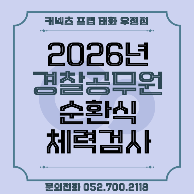 안녕하세요 커넥츠 프랩 태화우정점 입니다 2026년도 부터는 경찰공무원 순경을 포함해 모든 경찰 채용시험에서 순환식 체력검사로 전환됩니다. 순경은 처음 실시되는 순환식 체력검사로 2026년 1차 시험을 앞두고 중앙경찰학교(충주)는 실제시험과 동일한 환경에서 체력검사를 직접 체험할 수 있는 기회를 제공한다고 합니다. 12월 16일 부터 '순환식 체력검사 상설센터'를 일반에 공개하고 경찰 수험생을 대상으로 체험 프로그램을 운영합니다 체험 프로그램은 매일 선착순 60명을 대상으로 12월 16일 ~ 12월 31일 까지 시험운영하고 이후, 체험인원과 운영시간을 확대해 1월 5일 ~ 3월 13일 까지 추가 확대운영 예정 입니다. 참여신....... <img src="https://blogthumb.pstatic.net/MjAyNTEyMjJfMTk2/MDAxNzY2Mzc5MDYwNzMw.V0jYx_NE96yaoTcs-A4EyXIq6EdU1PvnQF1lfkmmdF4g.rdpdFJY1I_ga6zPFZUv0d5cY4ifSfrZxaTKZ96ERoFMg.PNG/%C5%C2%C8%AD%C1%A1-001_%2821%29.png?type=s3" />