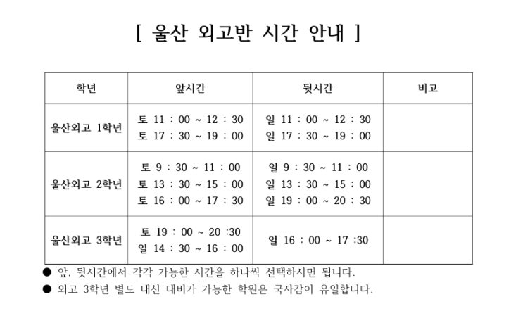 어느덧 날씨가 포근포근합니다~ 봄을 맞이하여 울산 외고반 개학 시간을 안내 드리고자 합니다. 3월 3일(화)부터 적용되는 시간이며 외고반은 큰이변이 없는 한 1학기동안 계속 이 시간으로 별도 수업을 진행합니다. 울산외고 모든 학년, 많은 학생들이 다니는 만큼 외고만의 내신 유형에 맞는 수업과 자료를 철저히 준비합니다. 꾸준하게 외고 학생들이 국자감을 다니는 이유는 결과로 보여드립니다. 참고로 이번 울산외고 3학년 입시 결과입니다. 더 많은 학생들의 입결이 있지만 2년 이상 꾸준하게 다닌 학생들만 집계했습니다. 학사 일정에 따라 변동이 있을 수 있겠지만, 내신대비는 3월 23일부터 시작할 예정입니다. 상담 문의는 010 6318 ....... <img src="https://blogthumb.pstatic.net/MjAyNjAyMjRfMjMy/MDAxNzcxOTA1ODQxOTEy.yZqYRp2N9RXlHFZdC0sAQqx3lH0pu8gfqFiUHQba1tMg.u7-1zfHG11xHsMeOCEvBR5vVkZMvIBMoe4xJNiY7pYIg.JPEG/%BF%DC%B0%ED_%B0%B3%C7%D0_%BD%C3%B0%A3.jpeg?type=s3" />