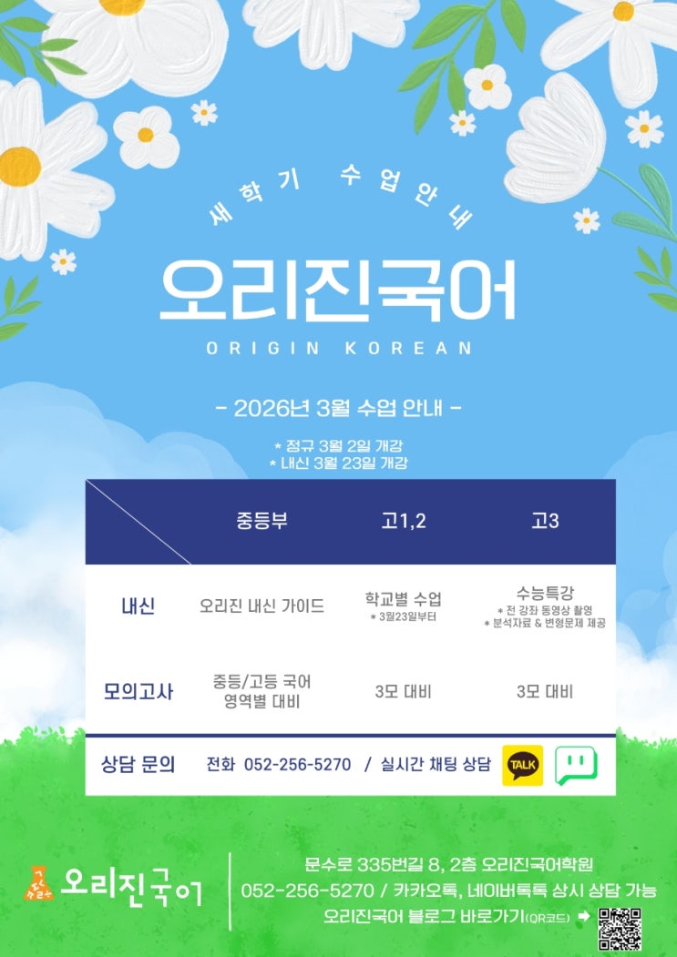 반갑습니다. 오리진국어학원입니다. 오늘은 오리진국어 3월 수업을 소개합니다. 중등부 학년에 맞춰 중등기초, 중등심화, 고등기초 국어 영역별 수업이 진행 중입니다. 내신 기간에는 오리진의 내신 가이드 프로그램에 맞춰 주도적으로 학습할 수 있도록 지도합니다. 고1,2 3월 모의고사를 기준으로 3모 대비, 학교별 내신 수업을 진행합니다. 학교별 내신 수업은 재원생 대상으로 시간 조사 후 편성됩니다. 교과서 범위는 물론 외부 지문 분석까지 꼼꼼하게 이루어집니다^^ 고3 지난 2월부터 수능특강 문학 현대시, 고전시가 영역 수업을 시작했으며, 3월 둘째 주에 마무리가 될 예정입니다. 3월은 산문과 독서 지문을 수업할 예정이며 학교 시....... <img src="https://blogthumb.pstatic.net/MjAyNjAyMjRfODcg/MDAxNzcxOTE1NDQ2MjEw.QEFWgaLriLbtxMRL_i43RFX5X5d8NukLuCYj9fLYYC4g._wZnCshKA-Jv2XcbRzLIJ4I7NGE3xsTHLFBw-lHszycg.JPEG/900%A3%DF1771914084232.jpg?type=s3" />