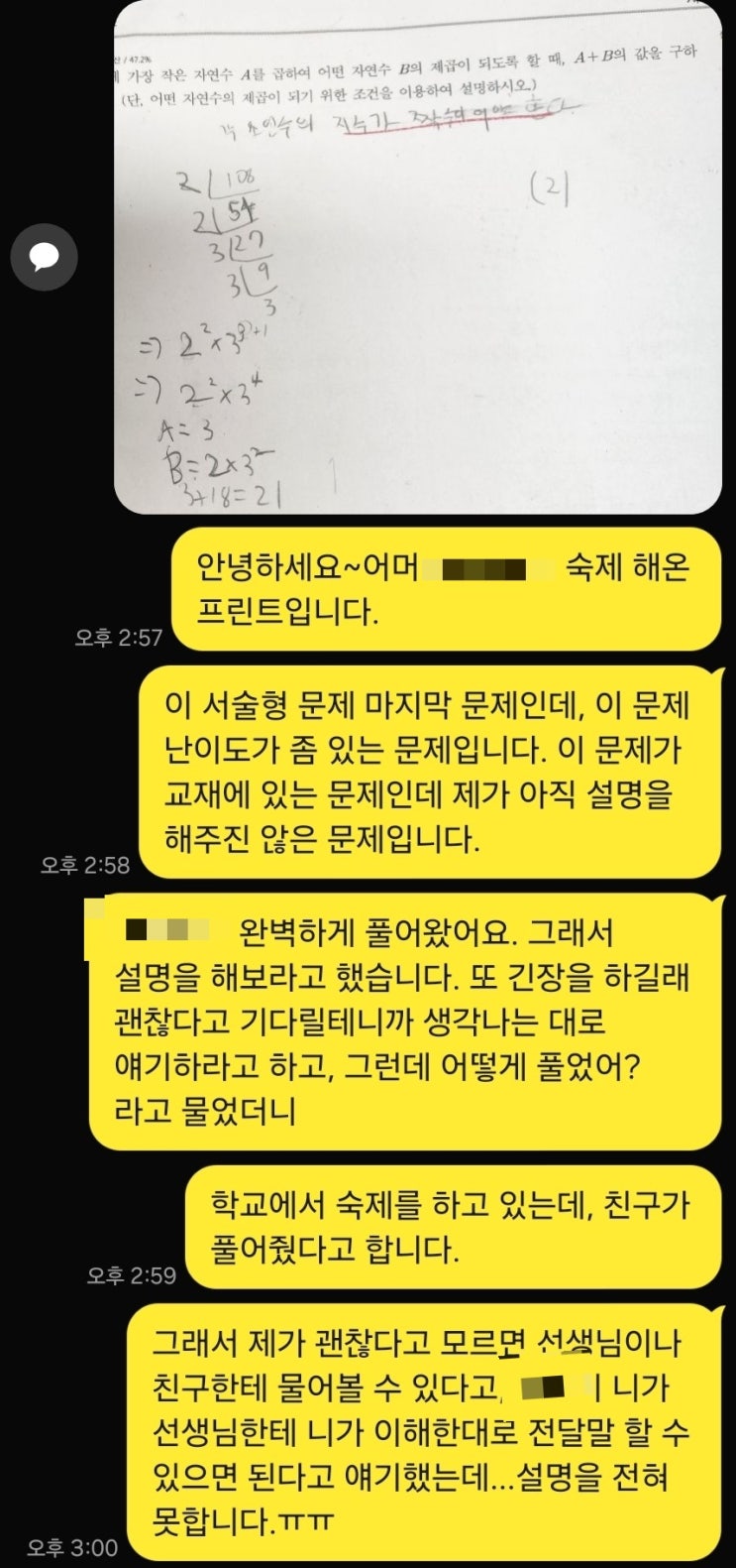 안녕하세요. 삼산 수학학원, 수학의 달인 탑클래스 입니다. 오늘 수업 시간에 한 학생이 숙제를 해왔습니다. 겉보기엔 평소와 다를 것 없는 숙제였어요. 그런데 문제를 하나 보자마자 느낌이 왔습니다. 이건 분명 아이 수준보다 한 단계 위 문제인데, 풀이가 너무 완벽했습니다. 그래서 자연스럽게 이렇게 물었습니다. > “이 문제, 어떻게 풀었어? 수달이가 너만의 방법대로 한 번 얘기해볼까?” 아이는 잠깐 망설이다가 솔직하게 말했습니다. “친구한테 물어봤어요.” --- 사실, 많은 경우 그냥 넘어가는 학원도 많을겁니다. 현실적으로 보면 이런 상황은 그냥 지나가기 쉽습니다. 숙제는 해왔고 답은 맞고 수업 진도와도 크게 상관없....... <img src="https://blogthumb.pstatic.net/MjAyNTEyMTdfMjEx/MDAxNzY1OTgyODI1NTQ5.5QSwgepv7RfqXUPFmPjNwxchOe3EyoxOqe4Y6Ch-WDkg.IeqYIrEyBe1PD2ricX74HqRvahgOlmuCLWF_z2BxJHUg.JPEG/1765982505162.jpg?type=s3" />
