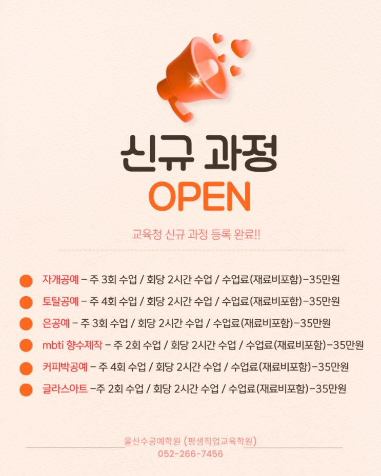 울산수공예학원에서 ✨ 신규과정 오픈합니다 ✨ 자개공예 · 토탈공예 · 은공예 MBTI 향수제작 · 커피박공예 · 글라스아트 신규 과정이 개설되었습니다 취미부터 직업까지 이어지는 평생직업교육 공예 클래스 전문강사분들과 함께 기초부터 차근차근 배워보세요. 울산수공예학원은 평생직업교육학원으로 성인과 직장인, 구직자 등을 대상으로 취업·창업·전문기술 습득을 목적으로 한 교육을 제공하는 평생교육기관입니다 수업문의 052-266-7456 #울산수공예학원 #신규과정오픈 #평생직업교육학원 #공예수업 #자개공예 #토탈공예 #은공예 #MBTI향수제작 #커피박공예 #글라스아트 #평생교육이용권 #울산평생교육이용권 #울산....... <img src="https://blogthumb.pstatic.net/MjAyNTEyMTlfMjQy/MDAxNzY2MTI3MDQ1NjQw.zddfGNEUfUsIHkc470mPVM2VbzROaHU5duXeYMShBqIg.LdPmAgAuCE6gWIYjTlYtTqv5c1Z9HMJGCGvhGxIAXPsg.PNG/900%A3%DF1766127023409.png?type=s3" />