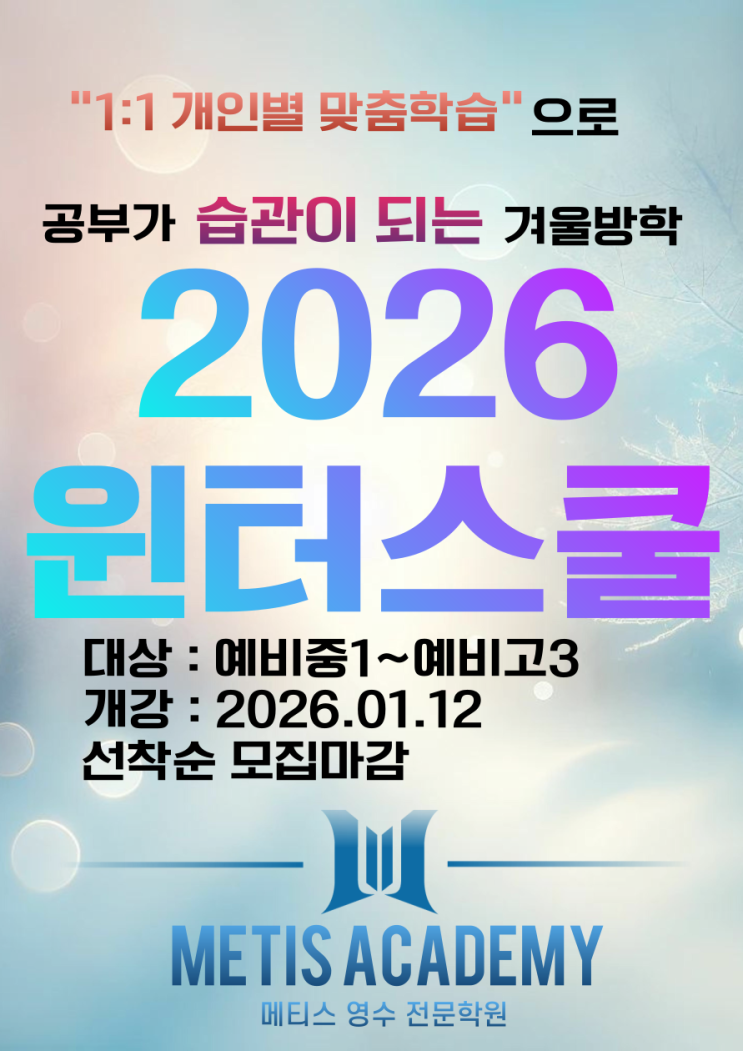 안녕하세요. 흔들리지 않는 실력완성 METIS ACADEMY입니다. 어김없이 2025년이 지나가고, 겨울이 다가왔습니다. 지난해에 이어, 올해도 저희 METIS에서 겨울방학 윈터스쿨을 준비했습니다. 겨울방학은 학생의 한해 공부에 대한 학습의 절반을 담당하는 시기입니다. 상대적으로 짧게 느껴지는 여름방학에 비해, 충분히 몰입해서 부족했던 학습이나, 학습태도를 올바르게 고칠수 있는 기간입니다. 하지만 명심해야 할 부분이 있습니다. 윈터스쿨만으로 학생의 모든것이 바뀌지 않습니다!! 이 글을 보는 학부모님들과 학생들이 꼭 보셨으면 하는 예시가 있습니다! 신입생 입학 상담을 받다보면, 가장 안타까운 경우가 있습니다. 바로 고등학교 1학년....... <img src="https://blogthumb.pstatic.net/MjAyNTEyMDJfMjAw/MDAxNzY0NjYwOTAzMzgz.OkN5vdLQwku22W8c540PacJmezZN65x-aYqN18SIPY4g.IMykEshGLWjbv3n1RXE5i4JdtyIj8XsUkq-lmMfivr8g.PNG/%C0%A9%C5%CD%BD%BA%C4%F0-001_%283%29.png?type=s3" />