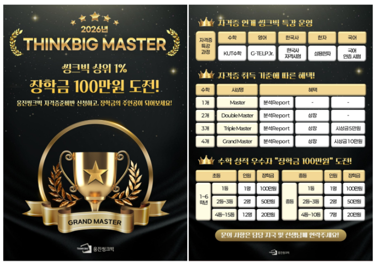 이번에 웅진씽크빅에서 야심차게 준비한 이벤트~~ 씽크빅 마스터제~~~~ 수학, 국어, 영어, 한자, 한국사까지 가능하며 자격증 취득 기준에 따른 혜택이 있어요 자격증 3개 부터는 시상금을 받으면서 학원을 다닐 수 있다는 기적같은 소식^^ 내가 공부에 자신이 있다면 수학 성적 우수자에 도전해 보는 건 어떨까요? 지금부터 장학금 100만원 도전!! 장학생이 되고 싶다면 010 9643 1132로 전화주세요!! <img src="https://blogthumb.pstatic.net/MjAyNjAyMDlfNTQg/MDAxNzcwNjIzNjgyMzA0.uYdxo-A5RtHIMPi8iIpayHxL40Qsf4TQg4SazUXKvEEg.U9N-rTCumjYJ1CT32HyYoJVJxwhrbTQcSQ-1cmkMlu8g.PNG/KakaoTalk_20260209_165402626.png?type=s3" />