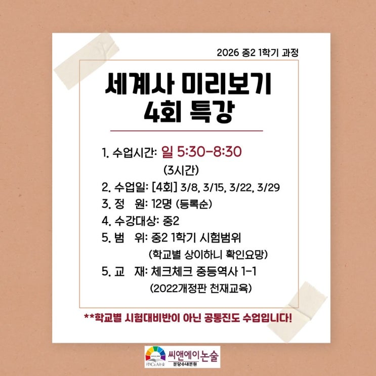 2026년 1학기 시험대비 " 중등세계사 미리보기 4회 특강" 중2 내신시험시 상위권 학생들도 가장 어려워하는 과목 세계사! 시험 전 마스터하기!!! ■ 수업시간 : 일 5:30-8:30 (3시간) ■ 수업기간 [4회] 3/8 , 15, 22, 29 ■ 수강대상 : 2026년 중2 ■ 강 사 : 한보람 T ■ 정 원 : 12명 (등록순 마감) ■ 수 강 료 : 240,000원 (회당 6만원) ■ 교 재 : 「체크체크 중등 역사 1-1 」 천재교육 -별도구매 ( 2022년 개정판) 본 수업은 정원제 수업으로, 중간퇴원이나 보강이 불가합니다. <img src="https://blogthumb.pstatic.net/MjAyNjAyMTlfOTcg/MDAxNzcxNDkzMTcwMzY2.iRLvnT1tWtaYRfJmIviRmx3ogGOpQVmh43zf_W73-MIg.48Bj-qUpaOUMTOId7EklM6sulah1EGET2WMVdiTua40g.JPEG/%C1%A6%B8%F1%C0%BB_%C0%D4%B7%C2%C7%D8%C1%D6%BC%BC%BF%E4._%281%29.jpg?type=s3" />