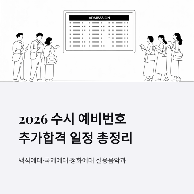 2026 실용음악과 백석·국제·정화 수시 예비 추가합격 일정/시간 이번 포스팅은 타 학교와 비교해 실용음악과 모집인원 / 지원자가 많고 예비번호 이동이 큰 편인 백석예술대학교·국제예술대학교·정화예술대학교 를 중심으로, 2026학년도 수시 합격 발표 이후 추가합격(충원) 발표 일정과 확인 포인트를 한 번에 정리했습니다. 실용음악과는 중복 합격 이동이 많아 충원 발표가 여러 차수로 이어지며, 학교마다 발표 방식(전화/조회)과 등록·납부 마감 시간이 달라 ‘날짜는 아는데 시간’을 놓쳐 탈락하는 경우가 생길 수 있습니다. 이 글에서는 3개교 일정표와 날짜순 통합 체크표, 그리고 실수 방지 체크리스트까지 함께 제공해 추가합격 기간....... <img src="https://blogthumb.pstatic.net/MjAyNTEyMThfMjE3/MDAxNzY2MDYyMTYxMTAy.rk1TMAKC3R-tVK6S4D8_Ti3UyFcRKTl69oMhiMcPF-8g.pY8GaIWvrYIFwVeJrQwOUHM1XYv1tQelJWofwOvqARMg.PNG/1_2026.png?type=s3" />