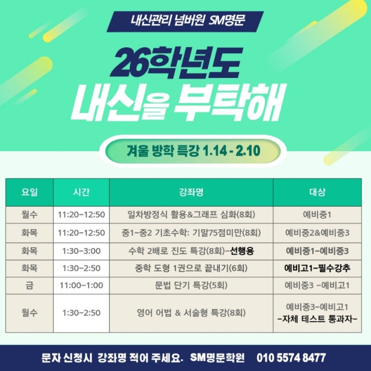 용죽학원 SM명문학원 26학년도 겨울방학 특강안내입니다. ☆ 수학특강☆ 1. 2배로 진도 정규 수업을 2배로 늘립니다. 겨울방학 언 제까지 겨울잠만 잘 것인가? 개념진도 나가는 속도가 2배가 되게 해서 개념선행이 필요한 학생에게 적합합니다. (상위권 추천) 2. 기초 수학 SM명문학원에 25년도 6월이후 등록학생, 전년도 1학기 복습이 필요한 학생에게 추천합니다. 또는 기말지필고사에서 75점미만자가 대상입니다. 3. 일차방정식활용 및 그래프 심화 예비중등학생들에게 꼭 필요한 단원입니다. 정규수업에서 깊이 다루기에는 시간부족. 상위권 학생들이 깊이 있게 공부하기에 좋습니다. SM명문학원의 10년이상 시그니쳐 특강수업! (중1-1 개념....... <img src="https://blogthumb.pstatic.net/MjAyNTEyMjBfMTgy/MDAxNzY2MTgyOTk0OTIz.lV1KmszzQvivKmPxSKccQYp7MHJhnDuVMuNtQgPR43Qg.ThGOLQgbPKTHuxRe6BHmMf3XMUiCEKermc5tm7frNQog.JPEG/900%A3%DF1765546748950.jpg?type=s3" />
