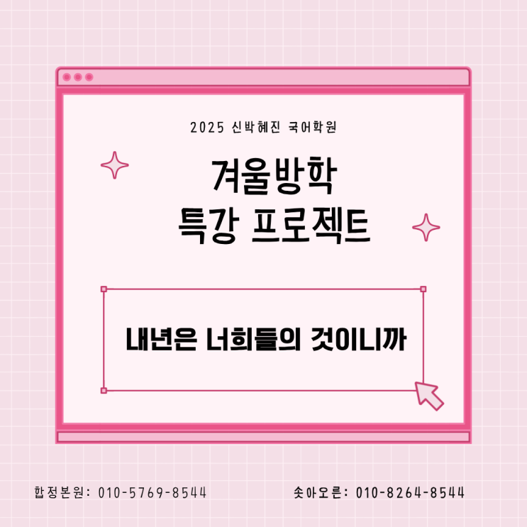 안녕하세요. 신박혜진 국어학원 겨울방학 특강안내입니다. 겨울방학 특강 신청 기간은 12/20 토요일 오후 10시 ~ 1/11 오후 10시까지입니다. 재원생 우선 접수를 도와드리고 있습니다. 2025 겨울방학 특강 신청 방법은 아래의 네이버폼으로 작성해주시면 상담 도와드리겠습니다. 신청 인원 수가 많을 시에는 조기 마감이 이루어질 수 있으니 많이 비교해보시고, 신속하게 연락 주시기 바랍니다! 감사합니다. <img src="https://blogthumb.pstatic.net/MjAyNTEyMjBfMyAg/MDAxNzY2MTYwNjIzODAw.-amUP83fApTxEpbC9ONZzDbsnBkn-7mum3Ein9gk7kog.zIeco1UN0gKcJqZ3a_MlSYril7SrI9JLwARGHYhkhn4g.PNG/1.png?type=s3" />