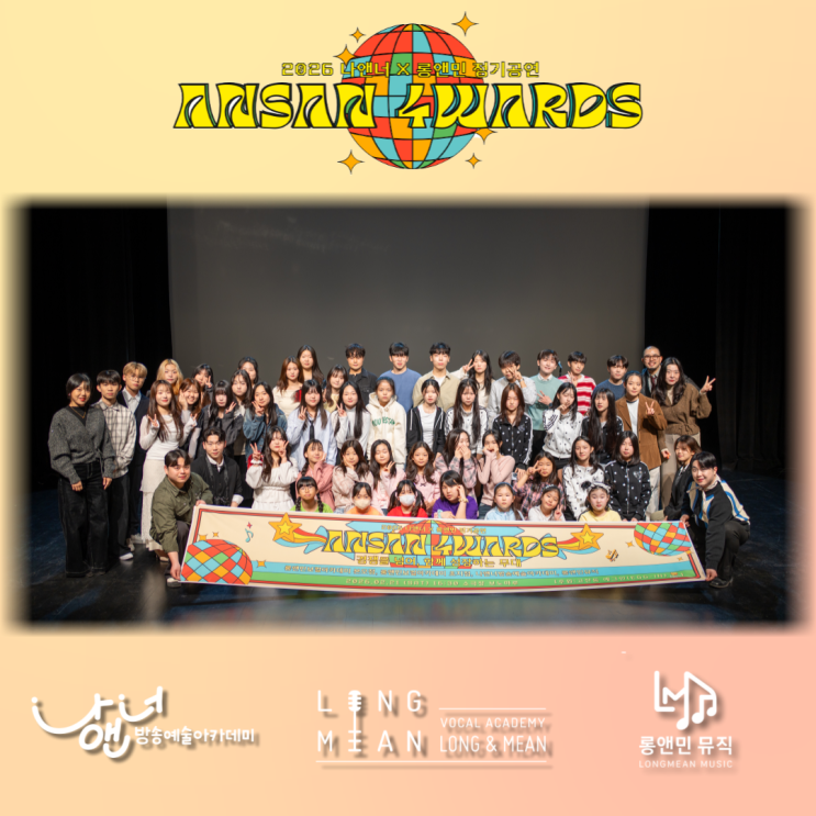 안녕하세요 '꿈을만드는노래소리' 안산실용음악학원 롱앤민보컬아카데미 입니다:) 롱앤민 초지점 x 롱앤민 본오점 x 나앤너방송예술아카데미 x 롱앤민뮤직 이 함께한 2026 학생 정기공연 <ANSAN 4WARDS> 2월 21일 토요일 뜨거운 환호 속에 멋지게 마무리되었습니다 이번 공연은 기존 정기공연과는 조금 달랐는데요! 단순히 "무대를 보여주는 발표회"를 넘어 ✔ 경연 형식으로 진행된 첫 시도 ✔ 네 개의 공간이 함께한 연합 무대 ✔ 그리고 앞으로 더 확장될 무대의 시작 이라는 점에서 정말 특별하게 기억될 공연이었습니다✨ 공연 준비 과정부터 무대 위에서 느껴지는 긴장감, 그리고 투표로 이어지던 그 순간까....... <img src="https://blogthumb.pstatic.net/MjAyNjAyMjRfMTM5/MDAxNzcxOTE1NDA2Mzg5.tOZb3RAiQeimE3qP5_LOsLewN1Mr6xCYg7XNVa6dcKcg.-VQKo7YxuxtY40pvZlpsHVcWQAb306OajSwSxkuPw5Ag.PNG/%BA%ED%B7%CE%B1%D7%BF%EB-%B8%DE%C0%CE-005.png?type=s3" />