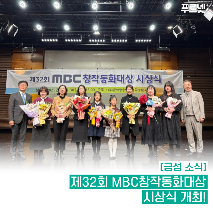안녕하세요. 금성출판사 푸르넷입니다! 금성문화재단과 MBC 문화방송이 제정하고 금성출판사가 후원하는 ‘제32회 MBC창작동화대상’ 시상식이 지난 12월 30일(화) MBC 골든마우스홀에서 열렸습니다! 1993년에 시작된 ‘MBC창작동화대상’은 지금까지 수많은 아동문학 작가를 발굴해 오며 대한민국 대표 아동문학 작가의 등용문으로 자리하고 있는데요. ‘제32회 MBC창작동화대상’은 총 1,400여 편의 작품이 접수되며 높은 관심을 받았다고 해요! 그럼, 영예의 수상작과 작가님들을 함께 만나볼까요? 제32회 MBC창작동화대상 시상식 기사로 보기▼ 제32회 MBC창작동화대상 창작 동화 장·단편 부문 대상 황섭균 작가의 <그린볼> “....... <img src="https://blogthumb.pstatic.net/MjAyNjAxMDhfMTc5/MDAxNzY3ODMxMDgzMDAw.Kg9ihv1HlTxwQCwaue60cxBL39t8Pti6nWnqEIGkH5Ig.r46s_GLI8GnbrmAfGv8R7o-I4uuxrR-GdWJSd0YIKkUg.PNG/%BA%ED%B7%CE%B1%D7%BF%EB_%BD%E6%B3%D7%C0%CF.png?type=s3" />