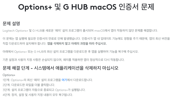 안녕하세요. 봉기쌤입니다! 각 강의실 맥북마다 mx master 3를 사용하고 있는데 어제부터 제스쳐가 안되는거에요. 스크롤 방향도 안되고 그래서 로지텍 옵션+를 켜봤더니 모든 맥북에서 무한로딩..ㅠㅠ 로지텍에서 무슨 오류가 났나봐요. 오늘 메일이 왔는데 패치가 되었다고 파일을 받으래요. 여기 들어가서 파일을 실행했는데요 그대로 무한로딩..ㅠㅠ 몇번을 다시 받아봐도... 찾아봤더니 크롬으로 받으면 안되고 사파리로 받아야 패치가 된다고 하네요!! 사파리로 들어가서 다운 받았더니 바로 잘 되더라구요~~~!! 여러분도 사파리로 들어가서 다운받아 보세요~~~! 다운받을 수 있는 링크 남겨 놓습니다~~! #로지텍무한로딩 #로지텍오류 #로....... <img src="https://blogthumb.pstatic.net/MjAyNjAxMDhfMjM2/MDAxNzY3ODUyMDI4OTg3.wdm4b7yhxU6vdab7beiB7qmLBiOPZpeXecDts964Bo4g.YAClfCEeJknc417kZDfBGxr_kRbfRQ1Gl3pdBBKOSE8g.PNG/image.png?type=s3" />