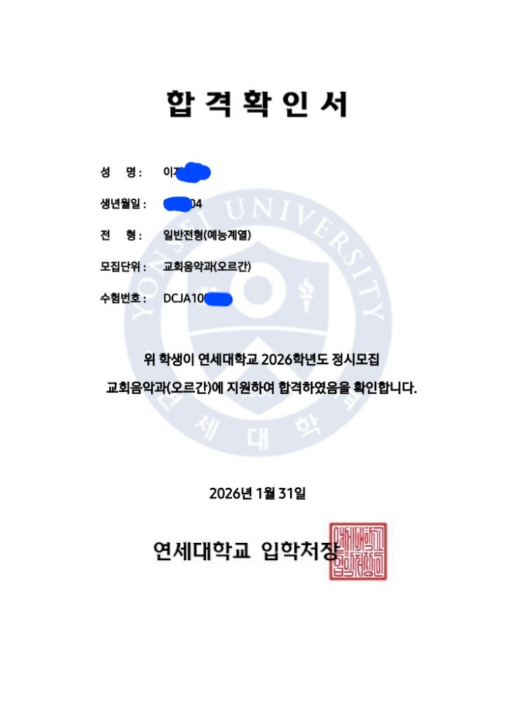 연세대 음대 오르간전공 합격소식입니다. 이번 지정곡이 쇼팽에튀드 작품10-4 로 나와서 더 다지면서 준비했습니다. 오르간과이지만 입시에서는 피아노비중이 훨씬 크기 때문에 더욱 기쁜 소식입니다♡ 1월 마지막 날 기쁜소식 전해준 제자에게 축하와 감사를 전합니다. #행신동피아노학원 #벨칸토피아노 #예중예고음대입시 <img src="https://blogthumb.pstatic.net/MjAyNjAxMzFfMjYg/MDAxNzY5ODQzODI5Njc4.CPkihkupeQHv-B_I5LZ1XLnDUDzzba6WSVMkoTyICMQg.7tD56wIQy_AduUEuvdzjIANkKv9v-Ec7T0MwDb62hQsg.JPEG/1769843307355.jpg?type=s3" />