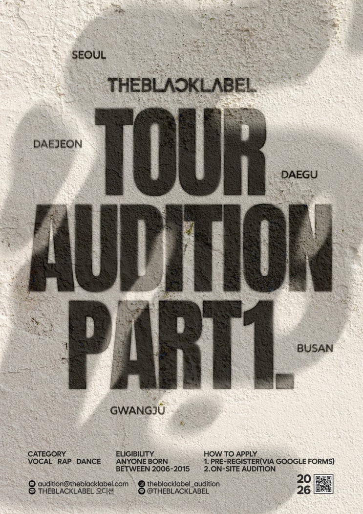 안녕하세요! 원흥오디션 학원 더음악아카데미입니다⭐ 새롭게 업데이트 된 오디션 정보 전달 해드릴게요 원흥오디션 학원 원흥오디션 학원 2026 THEBLACKLABEL TOUR AUDITION Part 1. 주최: 더블랙레이블(THEBLACKLABEL) 분야별분류: 가수, 댄스.무용 특징분류별: 기획사오디션, 어린이 분야별세부항목: 보컬, 랩, 댄스 연령별: 초등학생, 중학생, 고등학생 성별: 남자, 여자, 제한없음 개최지역: 서울, 대전, 대구, 부산, 광주 접수시작: 2025-12-24 접수마감: 2026-02-28 마감월: 2월 홈페이지: https://www.instagram.com/theblacklabel_audition ● 오디션 일정 대전 | 2026.01.17 (토) 대전청소년위캔센터 광주 | 2026.01.25 (일) K컬쳐....... <img src="https://blogthumb.pstatic.net/MjAyNjAyMDNfMTI2/MDAxNzcwMTE4MjgwNjgy.fRaYnP6yGgjmSvYFMnHEzXc7AonqSVSciyo673OM6Pwg.uPh-kGXz-lF2nZYNnS78UZTp0S9Fntm2vcoopTpMvp8g.JPEG/2026_THEBLACKLABEL_TOUR_AUDITION_Part_1..jpg?type=s3" />