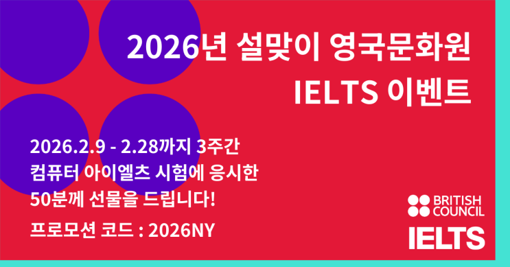 2026 설맞이 IELTS 시험에 응시하고 달콤한 혜택을 받아가세요. 이벤트 기간 내 컴퓨터 시험 응시자 중 총 50명에게 선물을 드립니다! 시험 응시 기간(시험일 기준): 2026년 2월 9일 - 2026년 2월 28일 (3주간) 접수 기간: 2026년 2월 5일 - 2026년 2월 27일 대상 시험: 영국문화원 주관 일반 컴퓨터 IELTS 시험 (Academic / General Training / UKVI 포함) 추첨 인원 및 상품: 이벤트 전 기간에 걸쳐 총 50명 랜덤 추첨하여 기프티콘 증정 - 티라미수 케이크: 5명 - 요아정 아이스크림: 15명 - 스타벅스 1만 원권: 30명 응모 방법: 온라인 접수 사이트에서 원서 작성 시 결제 전 단계에서 프로모션 코드 '2026NY'을 입력한 후 응시료....... <img src="https://blogthumb.pstatic.net/MjAyNjAyMDNfNDUg/MDAxNzcwMDgzNTA3NDU5.v9tlcNJKRYIg-Dz452N-iIfpc31KYj1It3lCw6Op_QQg.XkfpZHjO81_KR9Bdn3sG0j8Rx9S-60yV52FbsQOZ6Dgg.PNG/PNG_Pmax.png?type=s3" />