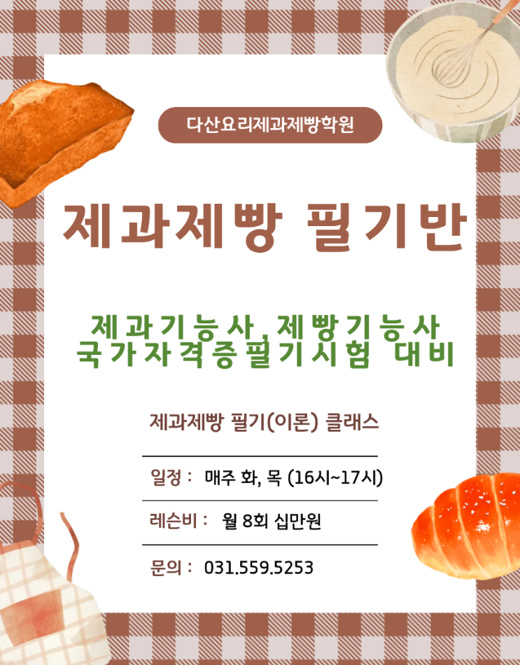 제과기능사·제빵기능사 자격증 준비를 시작하면 가장 먼저 마주하게 되는 관문이 바로 필기시험입니다. 문제 범위가 넓고 용어가 생소해 혼자 책으로 준비하다가 어려움을 느끼는 분들도 많습니다. 다산요리제과제빵학원 제과제빵 필기시험 대비반은 국가자격증 필기시험 합격을 목표로 핵심 이론을 체계적으로 정리해 주는 수업입니다. 제과기능사, 제빵기능사 필기시험에 자주 출제되는 내용을 중심으로 불필요한 암기는 줄이고, 꼭 알아야 할 부분만 집중적으로 다룹니다. 재료학, 공정 이론, 위생·안전 관리 등 필기시험에서 헷갈리기 쉬운 내용을 실기와 연결해 설명하기 때문에 이해도가 높고 기억에도 오래 남습니다. 실기 수업을 병행하....... <img src="https://blogthumb.pstatic.net/MjAyNjAyMDJfMTE2/MDAxNzcwMDEwOTk5MTUx.z2AjYiE1_Mi23ei85DdLTIgkTZamOoSUjqV3drvw4Dog.dgYqApWlLl8_lzJDIcM0kl8Id28KM8Y9kz2lRyEOmcUg.PNG/%C7%CA%B1%E2%BD%C3%C7%E8.png?type=s3" />