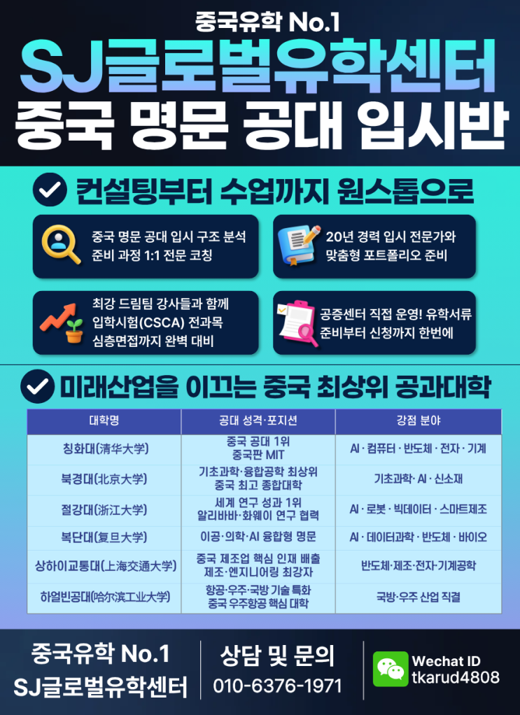 절강대학교(Zhejiang University) 공대 개요 절강대학(ZJU)은 중국 저장성 항저우(杭州)에 있는 중국 최고 수준의 종합연구중점대학으로 꼽히며, 중국의 C9 League(중국 아이비리그급 그룹)에 속해 있습니다. 중국에서도 베이징대·칭화대 다음으로 손꼽힐 정도로 명문으로 평가됩니다. 세계적·국내 순위 QS 세계대학순위 약 #44~49위권 (2025–2026) — 중국에서는 TOP3 수준. THE 세계대학랭킹에서는 약 #39위권에 진입. 연구성과 및 논문 영향력 지표에서도 세계 상위권 대학으로 평가됩니다. 절강대는 연구 및 교육 역량이 매우 뛰어나고, 글로벌 취업 및 대학원 진학에서도 높은 평가를 받는 국제적으로 인정되는 공대 진학 명....... <img src="https://blogthumb.pstatic.net/MjAyNjAyMDNfMTM5/MDAxNzcwMTE1MDAzNTIw.Xi7cPyCZMniKdy2e7YF7LOFv1vwdGw3NhjOJOW1aZDAg.OaqhSA_CFwiHGb2bh1DeqQwMIWAdE1RLS3QcINfMSbcg.PNG/%B0%F8%B4%EB%B0%B3%B0%AD%BE%C8%B3%BB.png?type=s3" />