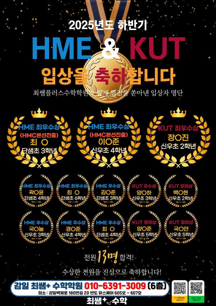 안녕하세요. 최쌤플러스수학이에요. 날이 하루하루 더 추워지고 최근에는 눈이 많이와서 미끌미끌 넘어지기까지 눈썰매보다 아찔했던 날도 있고 따뜨함에 롱패딩을 벗어 던지기까지 날씨가 2025년을 보내기 싫은가 봅니다. 하지만 우리 아이들이 자라나듯 배움도 늘어나고 나이도... 우리 어머님, 아버님은 한해의 마무리를 잘하고 있으신가요? 학원도 한해를 마무리 짓기위한 크리스마스 이벤트 준비에 그리고 마지막 시험이 될 전국창의융합수학학력평가 준비가 한창이랍니다. 연말에 모임도 많지만 우리아이들의 새학년 준비도 모자람이 없도록 계획과 준비에도 여념이 없죠. 이러던 와중 지난 11월에 치뤄진 HME & KUT의 시험결과가 발표....... <img src="https://blogthumb.pstatic.net/MjAyNTEyMTNfMjY5/MDAxNzY1NjIyMTUyNDk3.zMDjsuf0m5hYpVVHx3znxLApnR2lpUKE30PxOOO0Cogg.-riZNreGP95z03847SxRT_KVD56GoltI5GTbkrIUjLAg.JPEG/2025_%C7%CF%B9%DD%B1%E2_KUT_HME_%BC%F6%BB%F3%C0%DA_%C3%D6%C1%BE.jpg?type=s3" />