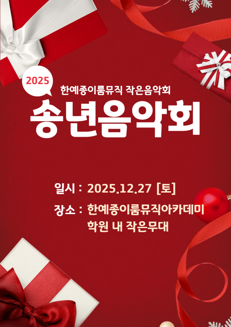 안녕하세요 한예종이룸뮤직입니다. 한예종이룸뮤직 우리들의 작은 음악회❤️ ‘2025 송년음악회’ 를 하게 되었습니다 12월 27일 토요일 오후 3시 장소는 한예종이룸뮤직아카데미 학원 내 작은무대 입니다 이번 연주회 드레스코드는 ! '크리스마스' 입니다 연주회 날 갈고 닦은 실력을 뽐내봐요 ! 기타 문의사항이나 상담은 아래 카카오 채널 혹은 상담 전화주세요 ♥ 저희 학원은 5호선 미사역과 연결되어 있어, 강동구와 광진구에서도 많이 찾아주십니다 ♥ <img src="https://blogthumb.pstatic.net/MjAyNTEyMThfMTU4/MDAxNzY2MDYwMzY5OTE1.l15reRAR2QMocfbT21DtG2LwivFPb8dKRzrDegbbQiUg.VHrpAfybP6UzMAxxKTQI-Oq_TK77nKYxlZ1zTg8G3bUg.PNG/%C7%D1%BF%B9%C1%BE_%C0%CC%B7%EB_%BC%DB%B3%E2%C8%B8.png?type=s3" />