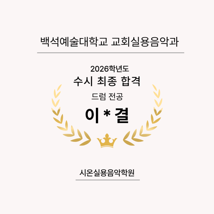 2026학년도 대학입시 수시 합격 소식 백석예술대학교 교회실용음악과 드럼 전공 합격! 기쁜 소식을 전해드립니다 우리 학원 수강생 이*결 군이 2026학년도 대학입시 수시 모집에서 백석예술대학교 교회실용음악과 드럼 전공에 당당히 합격했습니다! 실력으로 증명한 결과 이번 합격은 단순한 운이 아닌, ✔️ 꾸준한 개인 연습 ✔️ 전공에 맞춘 실기 집중 트레이닝 ✔️ 실제 입시 기준을 반영한 커리큘럼 이 만들어낸 값진 결과입니다. 특히 교회실용음악과는 앙상블 능력, 리듬 이해도, 실전 연주력이 중요한 학과로 드럼 전공자로서의 기본기와 음악성이 모두 요구되는 곳이죠. 시온실용음악학원의 입시 수업....... <img src="https://blogthumb.pstatic.net/MjAyNTEyMjRfMiAg/MDAxNzY2NTA1MzM5MTkz.IYdIhtw30j-OWyA2rj8GRSWjaKJA4zyx2lKJsocIDNAg.C1pYkJ1SGy2-bnO2iWSvr17f7RW2hYNHLvpxun8b65wg.PNG/2026_%C0%CC%C7%D1%B0%E1_%C7%D5%B0%DD.png?type=s3" />