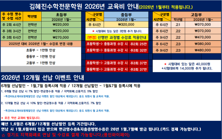 2026년 수강료 인상 안내 및 선납이벤트 안내드립니다.