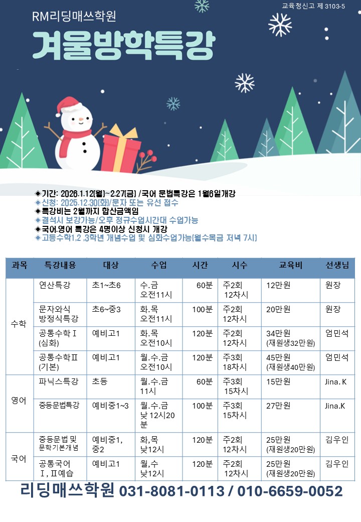 청덕동 겨울방학특강 안내|RM리딩매쓰학원