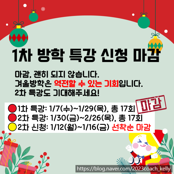 마감은 괜히 생기지 않습니다. 삼성영어셀레나 신흥덕 롯데캐슬 교실 겨울방학 특강 1차 신청이 마감됐습니다. 매년 이 시기에 비슷한 말을 듣습니다. "이번에는 안 하려고 했는데요." "아직은 굳이 필요 없을 것 같아요." 그런데도 막상 마감이 되면 부모님들 마음이 조금씩 흔들립니다. 정말 괜찮은 걸까? 우리 아이만 그냥 지나가도 되는 걸까? 그래서 오늘은 특강 내용이 아니라 왜 겨울방학 특강이 마감되는지에 대해 이야기를 해보려 합니다. 특강을 한 번도 빠진 적 없는 아이 소위 말해 특강 마니아입니다. 여름방학 특강, 겨울방학 특강. 특강을 열 때마다 참여합니다. 겨울방학이면 두 달 모두, 여름방학이면 최소....... <img src="https://blogthumb.pstatic.net/MjAyNTEyMjJfNDAg/MDAxNzY2MzcxMTAyODkx.KAJImfSIJ_hlAtQGFETJxZybhFuYUrBLZxeRcGOfUO0g.M8QacXokpymejboRoMlFJ17b8yhxRucqigbkGyTZ9asg.PNG/KakaoTalk_20251218_231001929.png?type=s3" />