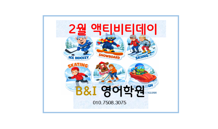 안녕하세요? 수지 B&I영어학원 입니다. 2026년 2월에는 우리나라 고유 명절인 설 뿐만 아니라 세계적인 축제인 동계 올림픽까지 열려서 그 어느 때의 2월보다 풍요로운 기분인데요. 동계 올림픽이 열리는 시기에 우리 아이들이 관련 학습을 한다면 보다 효과적일 수 있어서 수지 B&I영어학원 2월 액티비티데이 주제는 '동계 올림픽'과 연계된 겨울 스포츠로 선택했어요. 밀라노 동계 올림픽과 관련된 다양한 이슈에 관심이 많은 아이들과 함께 겨울 스포츠를 주제로 액티비티 데이를 진행하니 그 어느 때보다 더 집중력이 높았어요. 현재 읽고 있는 영어원서에서 가장 좋아하는 캐릭터를 고른 후에 다양한 겨울 스포츠 중에서....... <img src="https://blogthumb.pstatic.net/MjAyNjAyMjNfMjc1/MDAxNzcxODU3NzYxNjQ0.DrLC-XMyZVxXKqZojXA1HhAmLVgWSMmtgZa47aPEgsMg.5o5WjD3ve1xgcC32dCSp8XPmRIuX3TLG9EdNbkrliAMg.PNG/%C8%AD%B8%E9_%C4%B8%C3%B3_2026-02-23_234224.png?type=s3" />