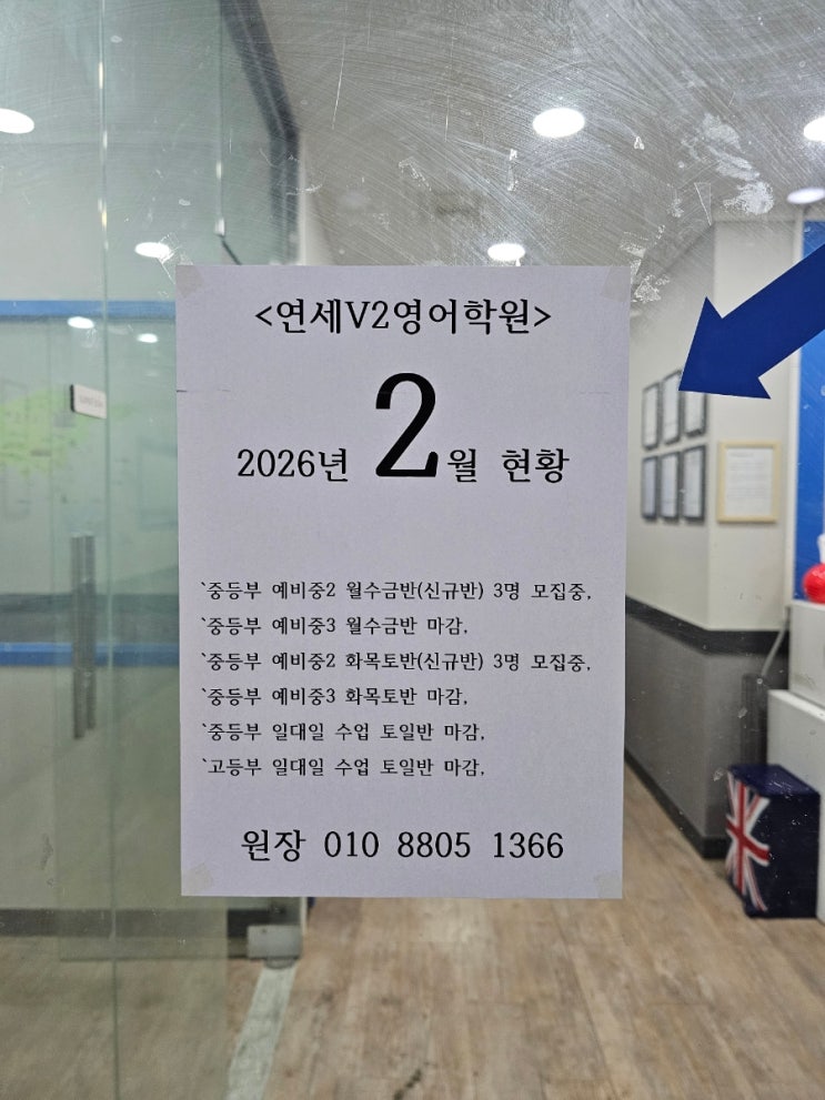 *중등부 예비중2 월수금반(신규반) 3명 모집중, *중등부 예비중3 월수금반 마감, *중등부 예비중2 화목토반(신규반) 3명 모집중, *중등부 예비중3 화목토반 마감, *중등부 일대일수업 토일반 마감, *고등부 일대일수업 토일반 마감. *반 정원 4명인 원장직강 수업입니다.* ※등록현황은 달라질 수 있으니 전화상으로 확인하시기 바랍니다. 원장 010 8805 1366 감사합니다. #파주영어학원 #운정내신영어학원 #운정영어학원추천 #운정중등부영어학원 #운정고등부영어학원 #운정수능영어학원 #파주수능학원 #운정내신대비학원 #동패동영어학원 #야당동영어학원 <img src="https://blogthumb.pstatic.net/MjAyNjAyMDNfMjA4/MDAxNzcwMTEwOTczNjY0.DoVS2Gp-0exWNRlFiX09EtLEbyvAiwJ6HtxqwTufwtgg.P4TEoRRd0W0FlG0tUHLlwWqK0yeXmAXHA7O0WiVHEhUg.JPEG/900%A3%DF20260203%A3%DF182818.jpg?type=s3" />
