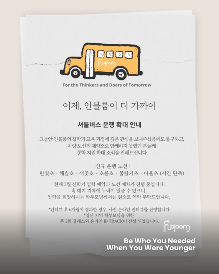 이제, 인블룸이 더 가까이 ✔️셔틀 버스 신규 노선 운행 안내 운정영어학원 - 인블룸어학원 한빛초 · 해솔초 · 석곶초 · 초롱초 · 물향기초 · 다율초 (시간 단축) 현재 운행 중인 노선 동패초 산내초 청암초 산들초 * 일산 지역 학부모님을 위한 주 2회 등원 클래스와 온라인 IB TRACK이 신설 되었습니다. 오직 #인블룸어학원 에서만 만나는 독보적인 글로벌 스탠다드의 교육을 경험하세요. 당신의 자녀에게 인블룸을 선물하세요. #운정영어학원 #운정맘 #운정신도시 #인블룸어학원 #운정어학원 <img src="https://blogthumb.pstatic.net/MjAyNjAyMDdfNzgg/MDAxNzcwNDY4MzA3MzU0.y55IxMjcDO3W-l8yrJhYebtiDkj543VU20x6Z_m8_9wg.nIicjP3wqmvWa8gz_5saYdJ2cJe11vG4z05q7VHzNBQg.JPEG/We_inspire_the_thinkers_and_Doers_of_Tomorrow_BMCA_%BA%ED%B7%E7%B8%DE%B9%CC%BC%FA%B0%FC_2025_IB_Exhibition.jpg?type=s3" />