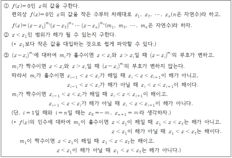 이번 글에서는 지난 글에 이어서 부등식의 해를 방정식의 해를 이용해 빠르게 구하는 방법에 대해 설명하겠다. https://blog.naver.com/zeta_math/224167689586 지난 글에서는 인수에 거듭제곱이 없는 경우만을 다뤘는데 이번 글에서는 거듭제곱이 존재하는 경우에 대하여 설명하겠다. 거듭제곱이 존재하는 경우도 지난 글에서 설명했던 거듭제곱이 없는 경우와 비슷하게 해석한다. 이차부등식 의 해를 구해보자. 먼저 이차방정식 의 해를 구해보면 해는 x=1뿐이다. x<1의 범위에 속하는 값인 x=0을 부등식의 좌변에 대입해보면 이고, 이 값은 양수이므로 주어진 이차부등식의 해가 된다. x<1의 범위에 속하는 다른 값들(x=....... <img src="https://blogthumb.pstatic.net/MjAyNjAyMDhfMTY4/MDAxNzcwNTE4NjI0NjAx.wvl_N9ZqSPk_czvNiRZ2E8YfpmZ7Eq9YSB_2wlstlN0g.ZF2v22vv9FawZOiyR9KXojoXWdudaADE_LEBoCFsD9kg.PNG/image.png?type=s3" />
