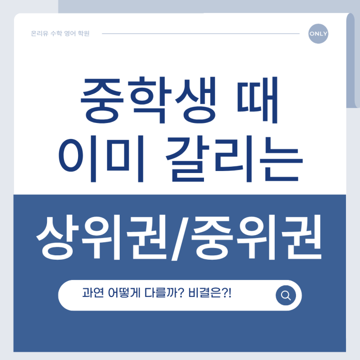 안녕하세요~ 온리유학원입니다^^ 중학교에 들어간 우리 아이들! 중학교는 상위권과 중위권이 갈리는 시기인데요. 어떻게 다른지 한 번 알아보도록 하겠습니다~ <자기주도학습의 본질> 공부시간보다 공부 밀도가 중요한 거 아시나요? 같은 시간 공부해도 성적이 다른 이유랍니다. 학생들이 자주 하는 착각을 알아볼까요? 여기 해당된다면, 오늘 이 글을 꼭 꼼꼼히 읽어보세요! 1) 자기주도학습이면 다 된다. 스스로 공부하는 힘? 당연히 중요합니다. 하지만 아이들이 스스로 공부한다고 착각하는 경우가 많습니다. 실제로는 계획도 세우지 않고 감으로 공부하는 경우도 있고요. 예를 들어 정해진 루틴 없이 그날그날 다르게 문제집 분량을 풀....... <img src="https://blogthumb.pstatic.net/MjAyNjAzMjBfMjU2/MDAxNzc0MDAyMzEzOTYx.ewc_P__YGr3cY4Kqfa2l4go1poV_jyaLjwjH4yeYhCgg.Xt7L48Q7KryAHsSNh9BS7trGJt_b2ONWRCy46QSbE5Ig.PNG/image.png?type=s3" />