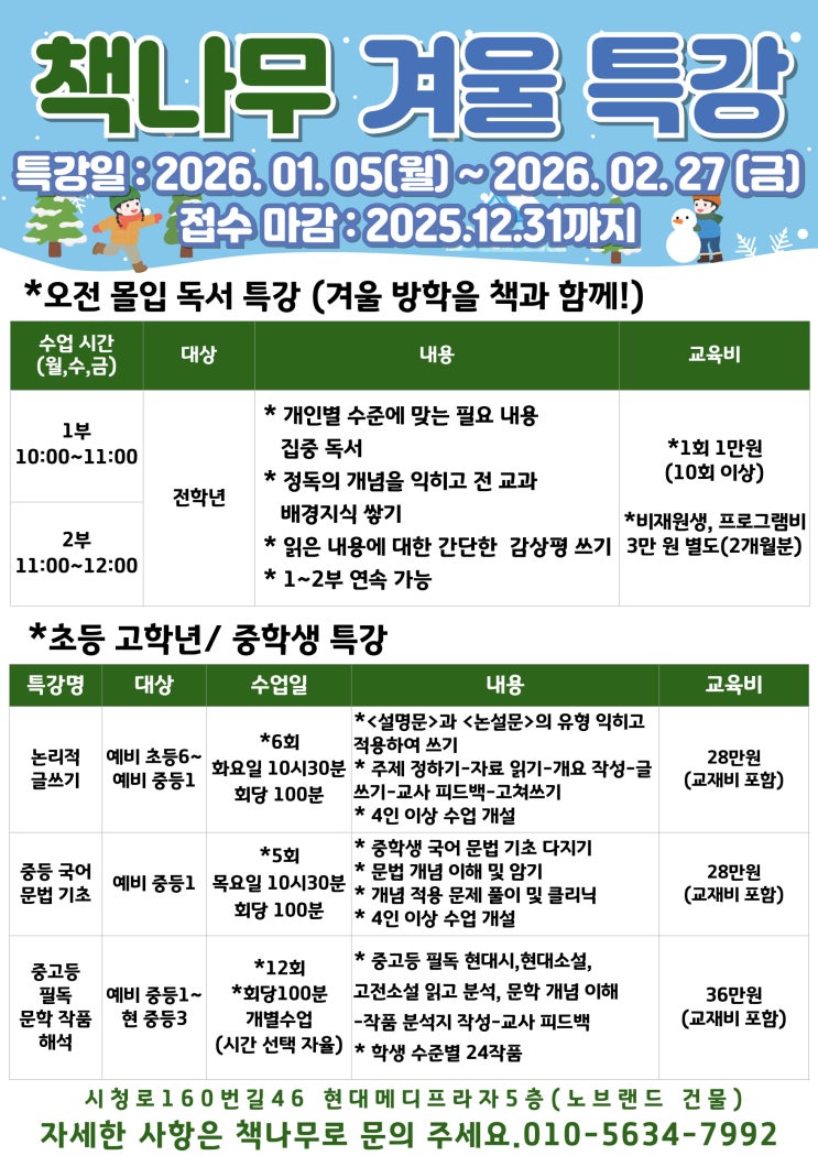 겨울 방학, 아이의 국어 실력을 키우는 가장 좋은 시간 책나무 독서논술 겨울 방학 독서·국어 집중 특강 안내 겨울 방학은 아이들이 가장 크게 성장할 수 있는 시기입니다. 학교 수업이 잠시 멈추는 이 기간, 읽기와 쓰기 능력은 오히려 더 빠르게 자랍니다. 특히 독해력·어휘력·문법·논리적 글쓰기는 방학 동안 꾸준히 앉아서 집중할 수 있을 때 가장 큰 효과가 나타납니다. 책나무 독서논술에서는 이번 겨울, 아이들에게 '읽고 생각하고 쓰는 힘'을 확실하게 잡아주는 특별 프로그램을 준비했습니다. * 월·수·금 몰입 독서 프로그램 아침의 조용한 시간에 방해 없이 몰입해 읽는 경험은 아이의 독해력과 집중력을 끌어올리는 가장 강....... <img src="https://blogthumb.pstatic.net/MjAyNTEyMjRfODgg/MDAxNzY2NTQ4NTI0MzEy.iOk0zign7pNzhgZ-lrXCg6LREq7aFvG5PftUCUDkjHog.w3OFYy2-fYa_e0LSa7La6MwSR4lPIyb8QlY_al8yc1Mg.JPEG/%B0%DC%BF%EF%B9%E6%C7%D0.jpg?type=s3" />