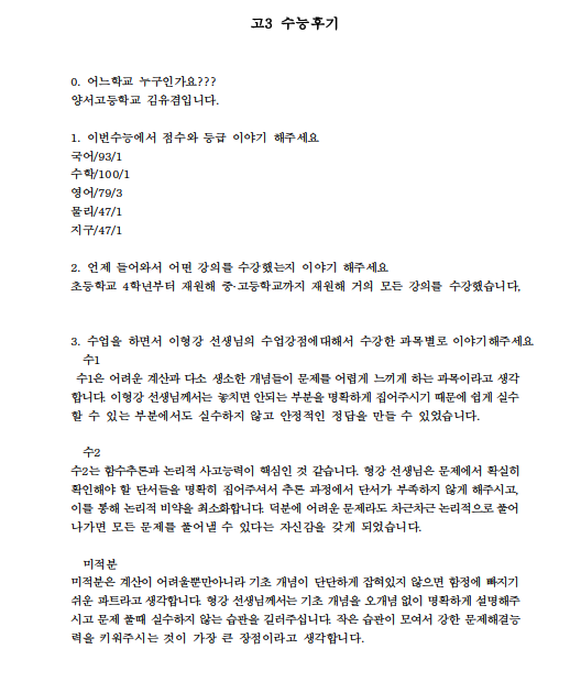 HK 수학학원 수능 실제 후기와 학생의 성장기