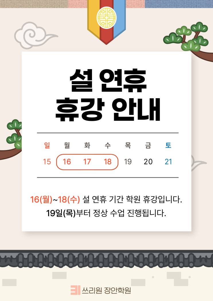 안녕하세요 쓰리원 장안학원입니다. 설 연휴(16~18일)간 학원 휴강 안내 드립니다. <img src="https://blogthumb.pstatic.net/MjAyNjAyMTBfMjcg/MDAxNzcwNzE2NjMzOTQ1.D1mBi86lD_AG7g4TpmGBln8dpqKmucEiQM5t4Atn7_Eg.OQ2tGJ5DepIgqUCfz3GY-yxzM7p7okX46DufCcWbP-sg.JPEG/%BC%B3%B3%AF_%C8%DE%B0%AD_%BE%C8%B3%BB%B9%AE.jpg?type=s3" />