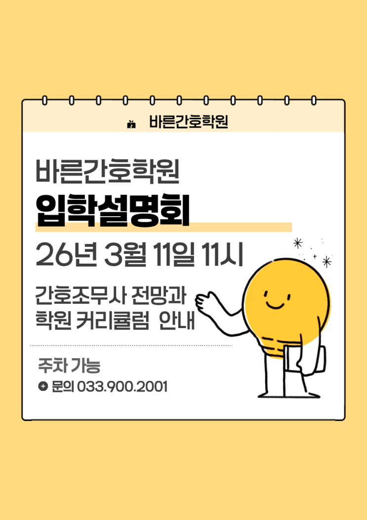 26년 상반기 개강! 26년 3월 11일 11시 입학설명회를 합니다~ 4월8일 국비반 /일반반 개강을 합니다 야간반은 수시 모집으로 일반반으로 모집중에 있습니다~ 간호조사무사의 앞으로의 전망과 학원 커리큘럼을 확인 할수 있는 입학설명회! <img src="https://blogthumb.pstatic.net/MjAyNjAyMjNfMTcx/MDAxNzcxODIwMDU0OTQ3.5ZR9_y3CZ5RUQq-rND3ORnDV3lQgVzWlvM9DvJljm70g.8-O0Z-21J3mFlL6liOoVdZfOqdEHnOL0IuvAXXZF4a4g.PNG/%C0%D4%C7%D0%BC%B3%B8%ED%C8%B8_22.png?type=s3" />