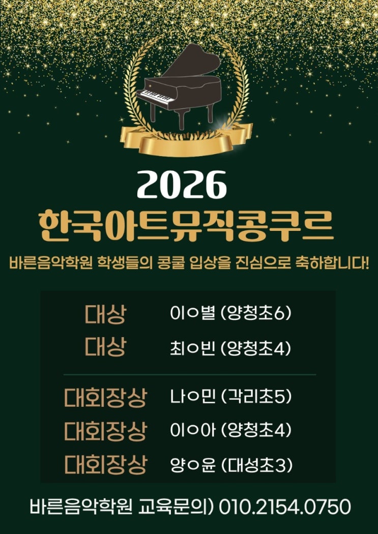 안녕하세요 저번주 토요일 우리 바른음악학원 친구들이 콩쿠르에 나가서 전원 상위권 상을 입상하였답니다❤️ 우리 콩쿠르반 친구들 주말 동안 나와서 연습하고 남들보고 몇배씩 연습하며 열심히 준비한 결과입니다^^ 토요연습이 끝난 후에는 분식 파티,피자 파티도 하면서 간식 타임을 가지며 아이들의 사기를 끌어올렸습니다 다른사람 앞에서 연주해보며 무대 경험을 익혀보는 시간도 가지고 무대 위에서 후회없이 보여주고 올 수 있도록 아이들과 선생님 모두 최선을 다했습니다 이번 콩쿠르를 준비하며 아이들이 보여준 노력과 성장 과정이 무엇보다 의미 있었던 시간이었습니다. 결과도 중요하지만, 목표를 향....... <img src="https://blogthumb.pstatic.net/MjAyNjAyMTBfMjUx/MDAxNzcwNzA0MDcxNzkz.B57ZZHrPTOk_uaBcGTYxh8xLHM13M0oGsMuEZCjqgS4g.IQR0920n8fLkPKpgtRC7Q3bxUI37cX-C_0A480lOLs4g.JPEG/900%A3%DF1770703217853.jpg?type=s3" />