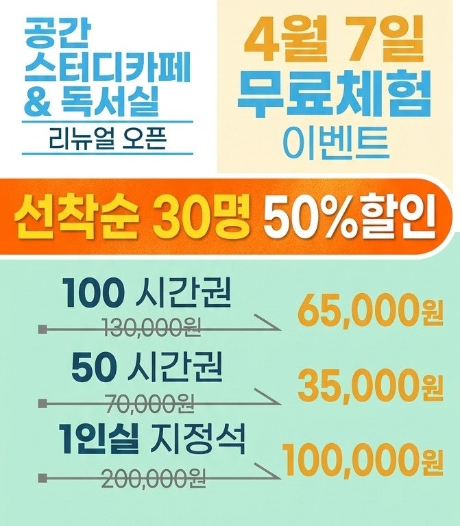 안녕하세요, [스터디카페 공간]입니다! 요즘 저희 공간은 4월 7일 리뉴얼 오픈을 위해 밤낮없이 변신 중입니다. ️ "진짜 공부하고 싶은 공간"으로 변하는 중! ㆍ ㆍ 투박했던 벽이 허물어지고, 여러분의 몰입을 도와줄 지역 최대 규모의 쾌적한 학습 공간이 서서히 모습을 드러내고 있습니다. 독서실존 스터디카페존 노트북존의 다양한 형태의 좌석 *독서실존* 완벽큐브형 1인실로 사물함이 비치되어 있고, 지정석으로 안정적인 나만의 공부 공간이 필요하신 분께 추천합니다. *스터디카페존* 큐브존, 포커스존, 윈도우존의 3가지 타입의 1인실로 구성되어 있고, 집중이 필요할땐 큐브존과 포커스존을, 탁트인 뷰를 원할땐 윈도우....... <img src="https://blogthumb.pstatic.net/MjAyNjAzMjFfMTMz/MDAxNzc0MDU1MzE4MzIx.P44bELPsog5KgoEHAZDlaQA1JJZ5I6bNPFgwQgurhLkg.p9rHMVaveT6qKRvKz-m7kmgvssd38x9KPtvSuuu8DSYg.JPEG/1774055318567.jpg?type=s3" />