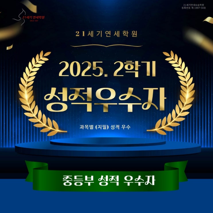 ✨중등부 성적 우수자✨ 2025학년도 2학기, 우리 21세기 연세 학원 중등부 학생들이 만들어낸 값진 성과를 공개합니다! 스스로의 목표를 향해 꾸준히 노력해 준 학생들, 정말 자랑스럽습니다. 과목별 성취도와 노력의 결과가 눈부시게 담겨 있는 이 명단은 학생들의 땀과 성장을 보여주는 특별한 기록입니다. 2025. 2학기 중등부 성적우수자 명단은 게시된 카드 이미지에서 확인해주세요! 앞으로도 21세기 연세 학원은 학생 한 명, 한 명의 가능성과 성장을 끝까지 응원하고 더 높은 목표를 향해 도전할 수 있도록 체계적으로 지원하겠습니다. 모든 학생들의 노력에 큰 박수를 보냅니다! 정말 고생 많았어요 <img src="https://blogthumb.pstatic.net/MjAyNjAzMjNfMzcg/MDAxNzc0MTk0MDMzNjM5.IgMt3F20WFsjpmfnVR_dmAgxY7Qjk4rYvtIpvmgQKZQg.-uuEH7VEgbj1WzEcN5OfKrEzSq9rsyZkxtVycSnX4GIg.JPEG/900%A3%DF1774023010431.jpg?type=s3" />