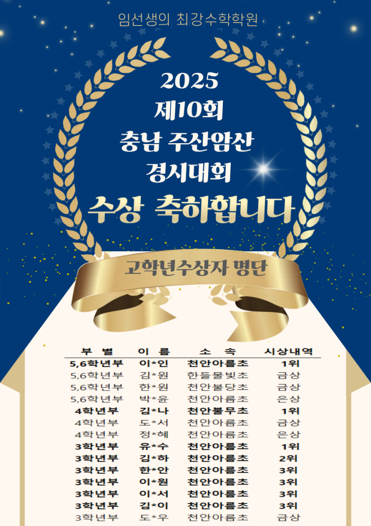 임 선생의 최강 수학 우리 학생들이 더욱 자랑스럽습니다. 열심히 노력한 결과 값진 결과입니다. **600여 명이 참여한 충남 어린이 주산암산 경시대회, 우리 아이들이 해냈습니다!** 지난 제10회 충남 어린이 주산암산 경시대회에서 우리 아이들이 멋지게 실력을 보여주며 당당히 수상했습니다. 이 대회는 유치부부터 초등까지 600명이 넘게 참가하는 지역 최대 규모의 경시대회입니다. 그 안에서 당당히 인정받은 실력이라 더욱 뜻깊습니다. 이 성과는 ‘머리가 좋은 아이’라서 나온 게 아니라 올바른 훈련 시스템과 꾸준한 집중력 훈련의 결과입니다. 왜 요즘 학부모들이 ‘주산암산’을 다시 찾을까? ✔ 연산 속도는 물론 두뇌 활....... <img src="https://blogthumb.pstatic.net/MjAyNTEyMjJfMTkg/MDAxNzY2NDAxMDczMTM0.ZJoCMKlfd1ZW6uSi6622sKLDkjfdt3PQaGgVv2KVZQgg.m00Gt-xJw4U9wmy2VT41Kuxt8obxS3AAJnnnr-4X4yYg.PNG/KakaoTalk_20251222_194914847_22.png?type=s3" />