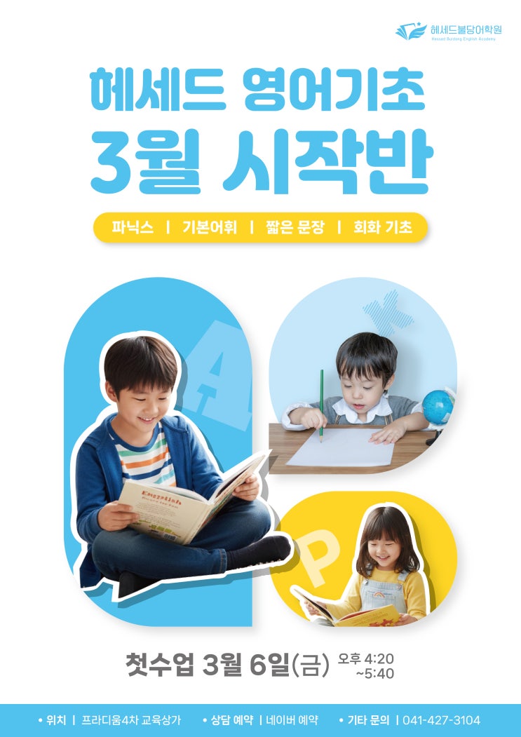 안녕하세요, 헤세드 불당어학원입니다 새 학기가 시작되는 3월, 영어를 처음 시작하는 아이들을 위한 영어기초반을 모집합니다. "영어 어려워요"가 "저도 할 수 있어요"로 바뀌는 헤세드 영어 기초반! 처음 왔을 때 "영어 어려워요, 막막해요" 했던 친구들도 수업을 거듭하면서 "선생님, 저 이거 읽을 수 있어요!" "저 할 수 있어요!" 라고 말하는 순간이 옵니다. 그 순간이 저희가 가장 좋아하는 순간이에요 자신감 있는 영어의 첫 시작, 헤세드가 함께 만들어 가겠습니다. 자세한 수업 내용은 아래 내용을 참고해주세요! 수업 시간 안내 첫 수업일 : 3월 6일(금)⏰ ▫️ 수업 시....... <img src="https://blogthumb.pstatic.net/MjAyNjAyMjZfMjg2/MDAxNzcyMTAwMTg0ODQ2.PidORhEBcfbIEr8GoqmsDOewgMUCfNw6VsFMNyGnzNMg.N5D3daUVaAp0bl2WR0-IjsAwgD4b1Tj9S85USb_2PQAg.JPEG/260226_%C7%EC%BC%BC%B5%E5%BA%D2%B4%E7%BE%EE%C7%D0%BF%F8_3%BF%F9_%BF%B5%BE%EE%B1%E2%C3%CA%B9%DD_%C8%AB%BA%B8_%C6%F7%BD%BA%C5%CD_%B4%EB%C1%F6_1_%BB%E7%BA%BB.jpg?type=s3" />