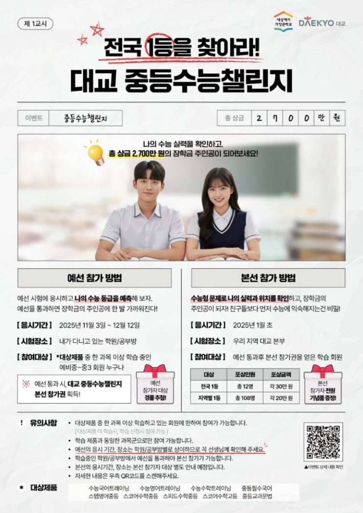 안녕하세요 솔루니천안아산충남 입니다. 전국 1등을 찾아라!! 대교 중등수능챌린지 안내드립니다. 예선에서 통과한 예비중~ 중3 회원들 대상, 본선에서는 실제 수능형 문제로 정확한 실력과 전국에서의 위치를 확인할 수 있습니다. 응시기간 : 2026년 1월 14일 (수요일) 10:00~11:00 <국어&영어> 시험장소 : 충남 천안시 서북구 불당22대로 92, 마블러스티타워 5층(천안불당 Hive) 참여대상 : 예선을 통과하거나 본선 참가권을 받은 학생 시상내역 * 전국 1등(1명) : 상금 30만원 * 전국 12명 포상 * 지역별 108명 포상 * 참여만 해도 본선 참가 기념품 증정 유의사항 대상제품 중 한 과목 이상 학습 중인 학생만 참가할수 있습니다. (....... <img src="https://blogthumb.pstatic.net/MjAyNjAxMDdfMTg4/MDAxNzY3NzQ5ODcyNzg3.oBkJFn2zQ_XXh34DD_y8NRWkeMqw7C-n69zwg2OvzSYg.6zd4KOL8Rau8Z7oDgdSyjAXJFFZRODkWYt6xuabHX5Ug.JPEG/%C1%DF%B5%EE%BC%F6%B4%C9%C3%A7%B8%B0%C1%F6.jpg?type=s3" />