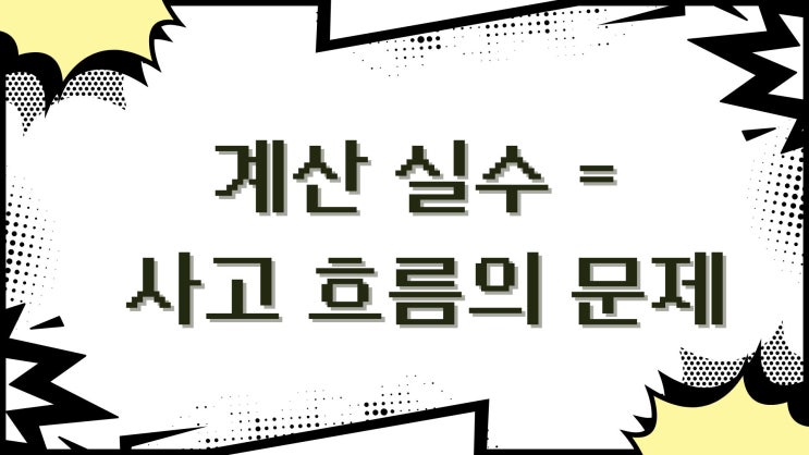 결론부터 말하면 계산 실수는 손의 문제가 아니라, 사고 흐름의 문제입니다. 1. “계산 실수가 잦아요”는 너무 쉬운 결론이다 상담할 때 진짜 자주 듣는 말이 있습니다. - “개념은 아는데 계산 실수가 많아요” - “알고 풀었는데 숫자에서 틀려요” - “시험만 보면 계산이 꼬여요” 그래서 보통 이렇게 정리됩니다. - 집중력 부족 - 연습 부족 근데 현장에서 보면, 그게 원인인 경우는 생각보다 많지 않습니다. 2. 계산 실수는 대부분 ‘앞에서 이미 흔들렸다’는 신호다 아이들이 계산 실수를 하는 문제를 자세히 보면 공통점이 있습니다. - 식을 왜 이렇게 세웠는지 설명 못 함 - 중간 과정을 외워서 내려옴 - 구조를 이해하지 않고 손이 먼....... <img src="https://blogthumb.pstatic.net/MjAyNjAyMjBfMTUz/MDAxNzcxNTc4OTIwODU3.kxMbjYhXvyq9kbNYt1AG-FCfv2vCy91DK2aRXDqKap4g.ZJQj9jGm0T9TONhodKxvnvpSWAmZ4cs0rfTKoEMXLeYg.JPEG/White_Black_and_Yellow_Comic_Book_Style_Presentation.jpg?type=s3" />