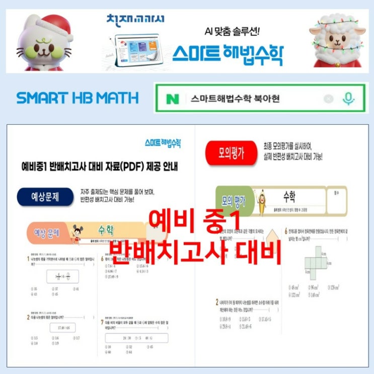 예비중1 반배치고사, 해법수학 북아현에서 함께 준비하세요 안녕하세요. 해법수학 북아현입니다. 예비중1 반배치고사 초등학교를 마무리하고 중학교 입학을 앞둔 지금, 많은 학부모님들께서 반배치고사 준비에 대해 문의를 주고 계십니다. “어느 정도까지 준비해야 할까요?” “아이 실력을 미리 점검해볼 수 있을까요?” 이런 고민을 덜어드리고자 해법수학 북아현에서 **예비중1 반배치고사 대비 자료(PDF)**를 준비했습니다. 실제 출제 경향을 반영한 예상문제 이번 자료는 단순 문제 모음이 아니라 ✔ 자주 출제되는 핵심 유형 정리 ✔ 초6 수학 필수 개념 점검 ✔ 계산력 + 응용력 동시 점검 ✔ 실전 감각을 기를 수 있는 구성 으....... <img src="https://blogthumb.pstatic.net/MjAyNjAyMTlfNzUg/MDAxNzcxNDg1MTUzNDYx.fIN1VebIzhkKaJGybLtWR-kp9b-P8qlojB1wPHeErWQg.Nt_5eSCPeEroSgdC2x7r-NukQMFeLn-fLQmmCIrP-pcg.JPEG/900%A3%DF1771485108876.jpg?type=s3" />