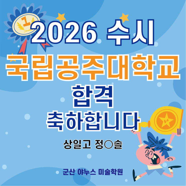 오늘은 정말 반가운 소식을 가지고 왔습니다. 기다려왔던 여러 대학들의 합격 발표가 이어지는 가운데, 오늘 드디어 공주대학교 2026최초 합격 소식이 전해졌습니다! 이번 합격은 더욱 의미가 깊습니다. 무려 35.4 : 1이라는 높은 경쟁률 속에서, 실기력으로 당당히 합격이라는 결과를 만들어냈기 때문입니다. 그동안 꾸준히 쌓아온 노력과 집중력, 그리고 포기하지 않았던 태도가 이렇게 좋은 결과로 이어져 정말 자랑스럽습니다. 학생 본인은 물론, 함께 달려온 시간들이 떠올라 더욱 기쁜 하루입니다. 다시 한 번 공주대학교 합격을 진심으로 축하하며, 앞으로의 대학 생활과 새로운 도전도 야누스 미술학원이 함께 응원하겠습니다! #군산야누....... <img src="https://blogthumb.pstatic.net/MjAyNTEyMTlfMTE2/MDAxNzY2MTI4MjkyNDU5.xFWRl1JzuXJfYWz42jk8HcmoQr6pZ7e74kL7BMQjBvMg.Rf_cjxgyyOOWD6AC808EgR9gJjrYXnJuEE3L1lEkcScg.PNG/%C7%D5%B0%DD%BB%FD_%281%29%28%C1%A4%C0%AF%BC%D62%29.png?type=s3" />