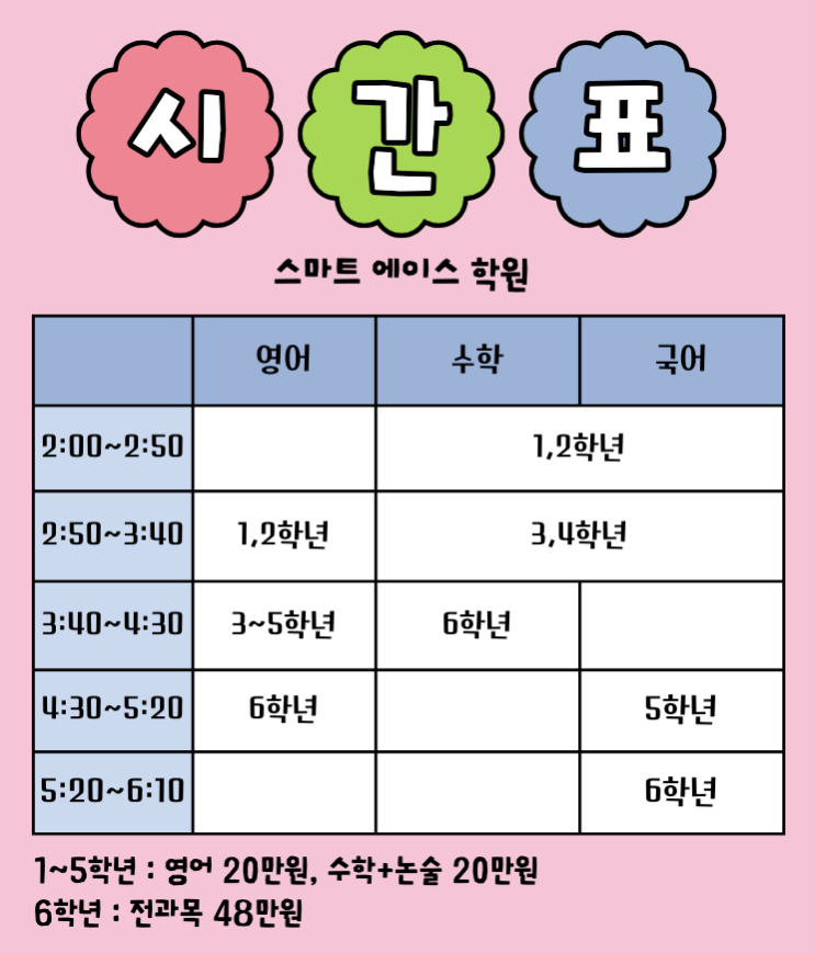 안녕하세요~ 스마트에이스 학원입니다! 2026년 3월부터 변경되는 시간표를 공지하겠습니다. 3일 무료 체험이 있습니다. 직접 아이들이 경험해 보고 학원 결정해보세요! <img src="https://blogthumb.pstatic.net/MjAyNjAyMjRfMTM0/MDAxNzcxOTE4Nzk1MDgx.pVMhd3A_ggE-SvC64QbZqXp_TW3CUblhOg80kIa_CC4g.WsN4YjbMlgn0KZiPsZ4oStNPfCt4qKsIJgydSdzaB60g.PNG/random%A3%DF87BEE62A%A3%ADB0B3%A3%AD4643%A3%AD9EBE%A3%AD398D4D353706.png?type=s3" />