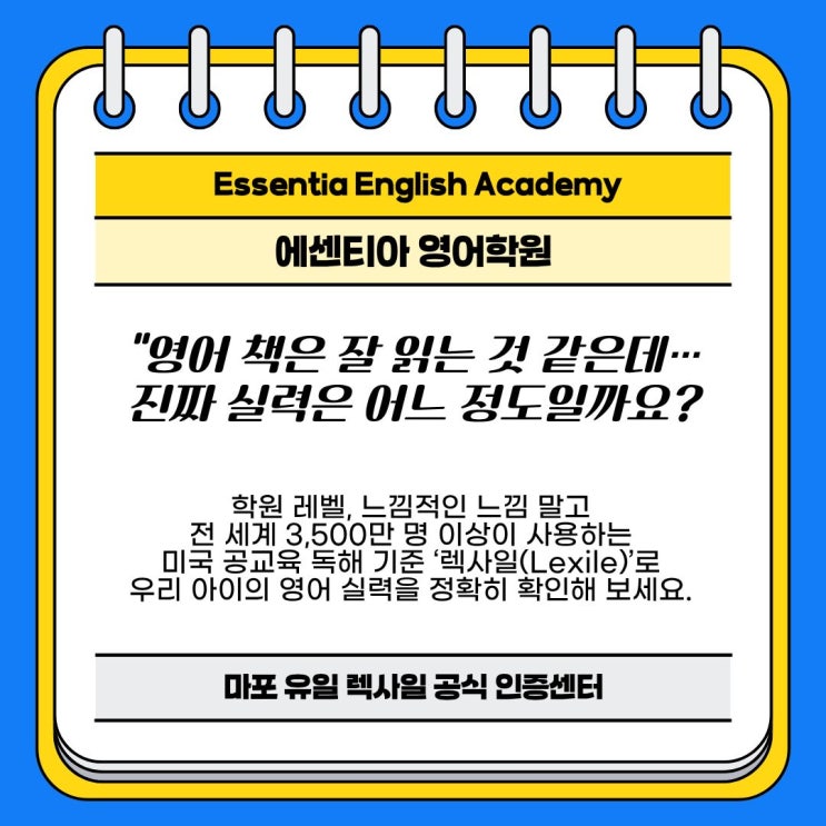[2월 한정] 에센티아 렉사일 분석 및 내신 로드맵 설명회 정상 검사비 35,000원의 렉사일 공식 TEST를 2월 설명회 예약자분들께만 전액 무료로 제공합니다! 일시: 매주 수요일 저녁 7시 대상: 초등 3학년 ~ 중등 3학년 학부모님 내용: 1. 어머님: 초등 고학년부터 중3까지 완성하는 [중·고교 영어 내신 대비 필승 로드맵] 강연 2. 학생: 실시간 [렉사일 공식 정밀 TEST] 실시 및 결과 상담 3. 학생 해당 중학교 내신 기출 상담 [2월 참석 특전] 렉사일 공식 정밀 TEST(3.5만 원 상당) 무료 체험 및 1:1 맞춤 학습 처방 [사전 예약제] 최소 3명 이상 신청 시 확정 진행됩니다. [예약 방법] 댓글창에 비밀댓글로 아이....... <img src="https://blogthumb.pstatic.net/MjAyNjAyMTJfMTIw/MDAxNzcwODgwMjA3Mjg0.rGTTDxRSXZ9Pa18ihjiaiGrJpUE9ceuB-NJcwMysopIg.H6jwE2rlwDKy7ChkPSVprhrp6X2JJCBvKh0wUjkQHfMg.JPEG/2.jpg?type=s3" />