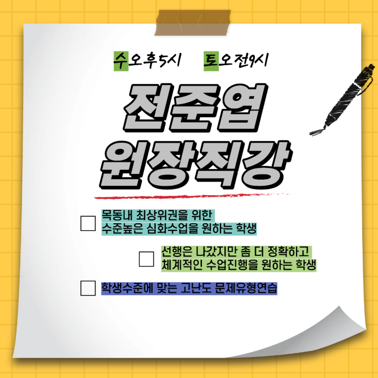 전준엽 원장 목동 본원 수업 수요일 오후5시/토요일 오전 9시 본인이 부족한 부분이 무엇인지 잘 알고 채워 나가는게 제일 중요합니다. 그 부분이 제일 힘들지만 잘 안 풀리는 유형이 싫어 풀 수 있는 문제만 풀면 실력은 결코 오르지 않습니다. 목동에서 20년간 수많은 상위권 학생을 가르친 전준엽 원장님 수업을 강추합니다 <img src="https://blogthumb.pstatic.net/MjAyNjAyMjBfMiAg/MDAxNzcxNTc5ODgyNTYz.SOInwpEIQcsF41NR3cVQSv1_aE-HPJwVExf-e7HGmKsg.V7XVhJgDuA4tVeUEvuirkFvzpfPTB1jlSxA6Otu_V7Ig.PNG/%C0%FC.png?type=s3" />