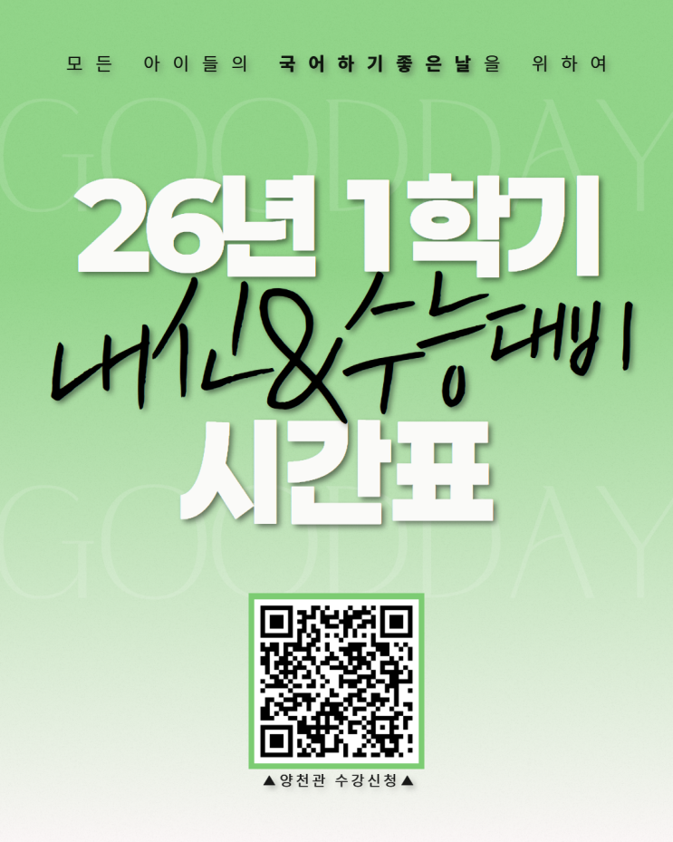 안녕하세요. 국어하기좋은날입니다. 목동국어학원 국어하기좋은날 양천관의 2026학년도 1학기 중간고사 고등 내신 및 수능대비 수업 시간표를 안내드립니다. 탄탄한 수업과 세심한 학습 관리로 학생들이 국어 실력을 차근차근 쌓아갈 수 있도록 국어하기좋은날이 함께하겠습니다.✨ 모든 아이들의 국어하기좋은날을 위하여 ☎ 국어하기좋은날2관(양천관) 02-2646-7039, 010-3972-7039 양천구 목동서로383 SJ라벨라2층 ♥ 인스타그램 : @goodday.kr ♥ 네이버카페 : 일공이공 <img src="https://blogthumb.pstatic.net/MjAyNjAyMjFfMjk4/MDAxNzcxNjU0MTI4NTk3.XKoYz42ibKmah1MYKFt5ixBzsIBp8TvwSprbQoXYa5wg.iAHQ7MF_GYUb2S1F8LbCnjyEpzVST4ZyPqDC49nrQBYg.PNG/KakaoTalk_20260221_120114135.png?type=s3" />