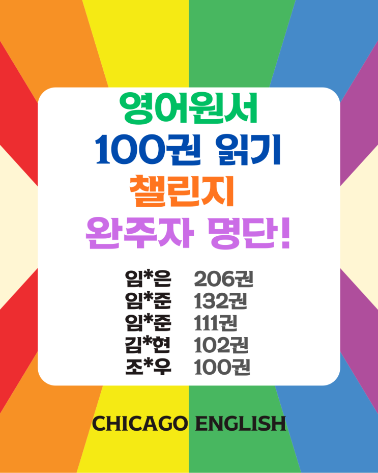 영어원서책 100권 읽기 챌린지 완주자 명단 공개! 지난 26년 1월 1일부터 2월 28일까지 영어 원서책 100권읽기 챌린지가 펼쳐 졌는데요. 원서책을 읽는 과정에서 어휘력과 독해력은 물론, 영어 자신감도 자연스럽게 높아진답니다. 무엇보다 '스스로 하는' 자기주도 학습이라는 점이 가장 큰 장점이에요. 우리 시카고 친구들이 열심히 참여해 드디어 완주에 성공하는 대단한 성과를 이뤄냈어요. 100권이라니, 정말 쉽지 않은 도전이였지만, 우리 친구들이 한장 한장 책장을 넘기며 자신의 속도대로 꾸준히 이뤄냈답니다. 챌린지에 완주한 친구들에게 축하의 박수를!!!! 앞서 공지한대로 완주자들에게는 시카고잉글리쉬 장학카드(1만원권....... <img src="https://blogthumb.pstatic.net/MjAyNjAzMjBfMSAg/MDAxNzczOTg4ODg1MTcz.goQufykZB4df_0NoFNjK6HR1Ehf1mejcyi1-h68RXZgg.glO7p36AP6FGDMefNROBZTpvPfT-KLNzdNV0xefO3hwg.PNG/2.png?type=s3" />