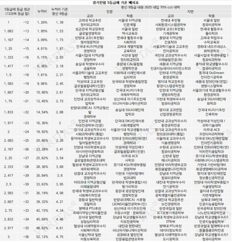 고교학점제가 시작이 되고 교과(내신) 성적이 본격적으로 반영이 되는 2028학년도 대입!!! 수시전형(학생부 교과, 종합) 지원 라인을 예측을 해 볼 수 있는 자료가 전무한 상황에서 경기진협(협력교 63개교)과 부산광역시 교육청(부산지역 88개교)에서 2025년 고등학교 1학년 1, 2학기(공통국어1,2 / 공통수학1,2 / 공통영어1,2 / 한국사1,2 / 통합사회1,2 / 통합과학1,2) 총 12과목의 누적 내신 성적을 발표하였습니다. 1) 경기진협(협력교 63개교, 16,110명 분석 자료) 해당 자료를 보면 학생부교과전형으로 인서울 대학을 지원을 할 수 있는 마지노선 내신 성적은 1.583등급(누적비 9.6%)로 9등급제로 환산하였을 경우 2.45등급이다. 학생부종....... <img src="https://blogthumb.pstatic.net/MjAyNjAzMjFfMTg2/MDAxNzc0MDc4OTYxMzY0.sGOI8mtakPFDUF4ZQsn3ecGbAPPhIs_U2drRHcax4tQg.ygK_1oU2hJRPKmYVQxyy0k2WZM4GmYK8_5gG9eldDycg.PNG/image.png?type=s3" />